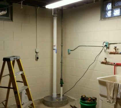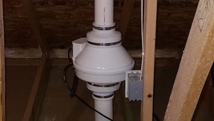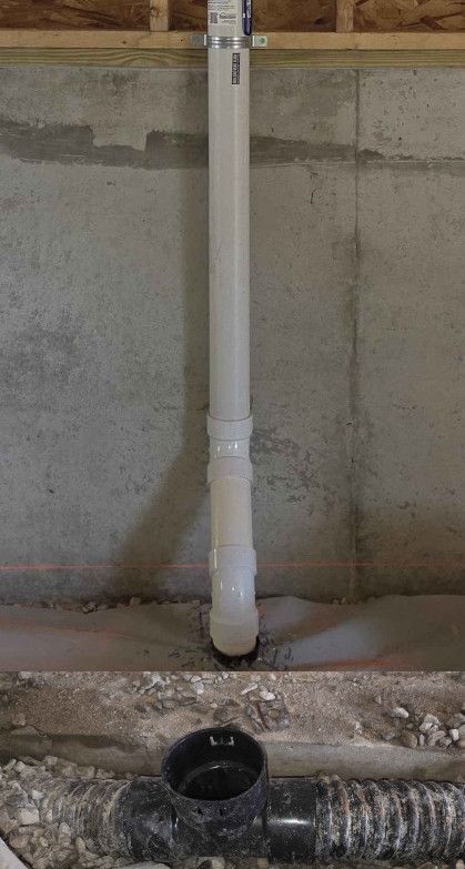 The suction point connects to the exhaust through a continuous pipe. We strive to find a route that is effective, meets standards, and is unobtrusive - from below the slab to the vent height and every level in between. Occasionally this is a challenge when retrofitting a finished home or squeezing into a new build where radon wasn't planned for.